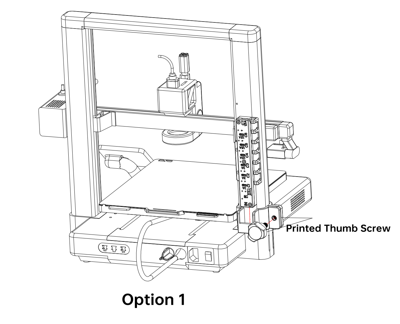 Insert the printed bracket into the position shown and secure it with either the printed thumb screw or M3×20 machine screws.