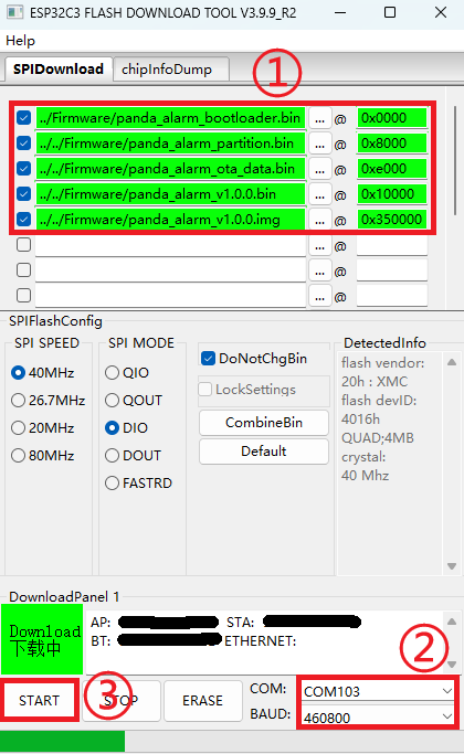 ① 设置.bin文件的烧录地址, 并且前面的复选框都勾选上