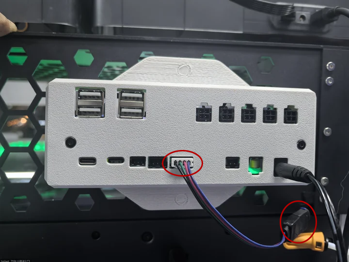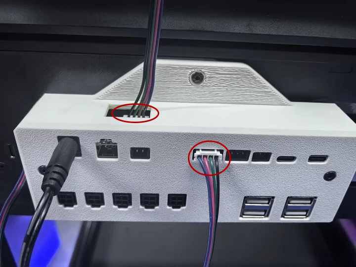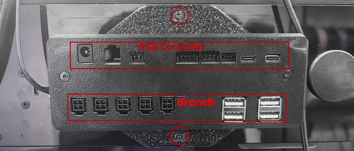 随后将Den背部金属封板拆除,将Panda Den的RGB灯条使用RGB Controller包装内3号连接线连接至控制板(如图中红色标记所示)后将安装板替换上去