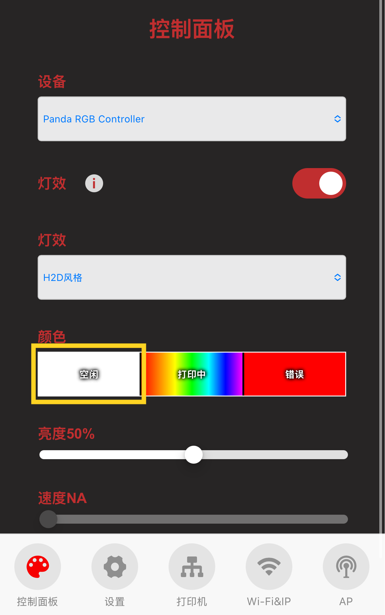 ⑥ 选择后,可以根据打印机调整灯光的颜色。你可以点击idle自定义RGB在打印机空闲时的颜色