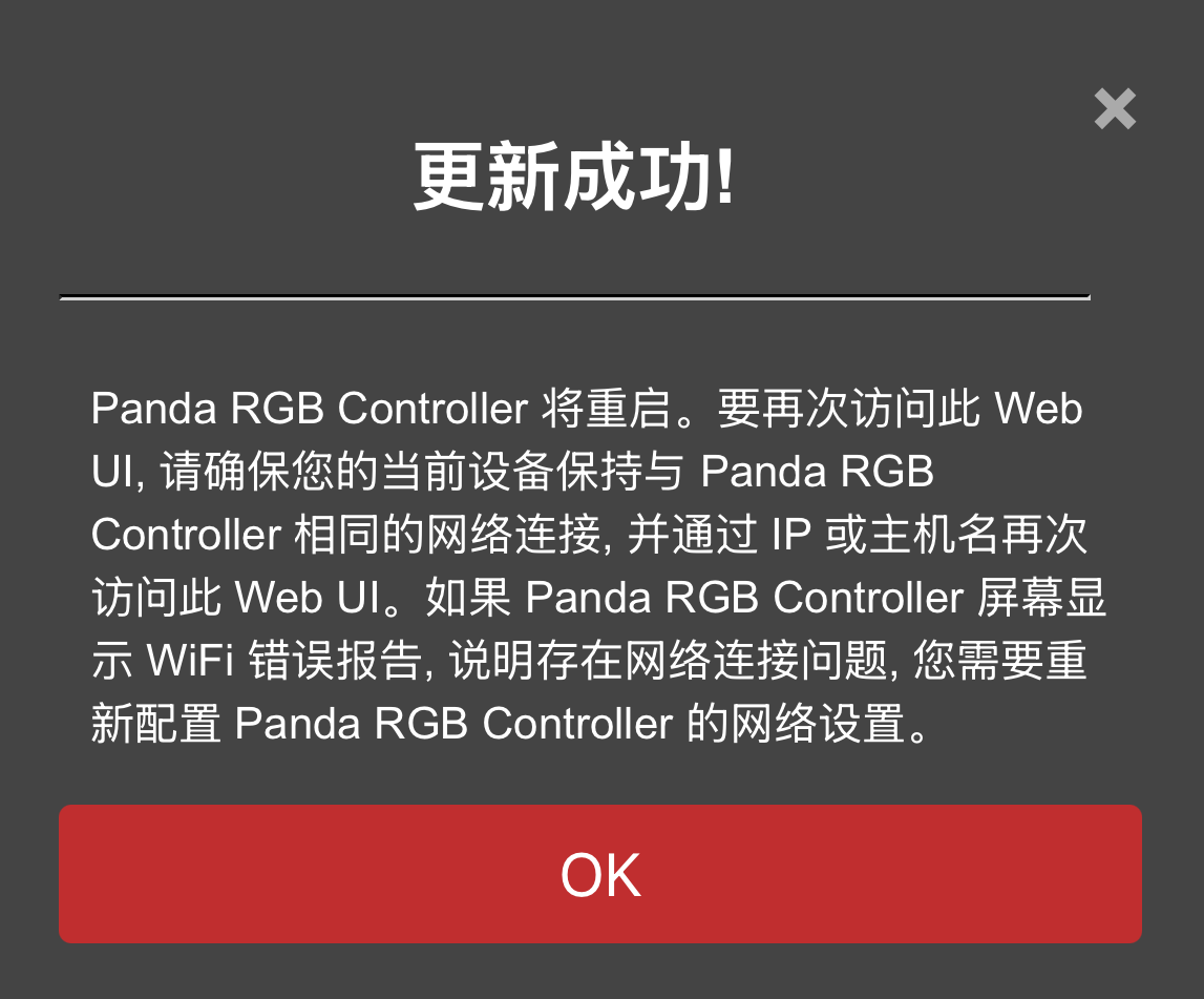 ③ IP地址的相关问题弹窗提示,如果 IP 地址 文本框未显示 IP, 请确保 Panda RGB Controller网络状态显示为 连接成功。如果显示为 未连接, 请配置网络设置。