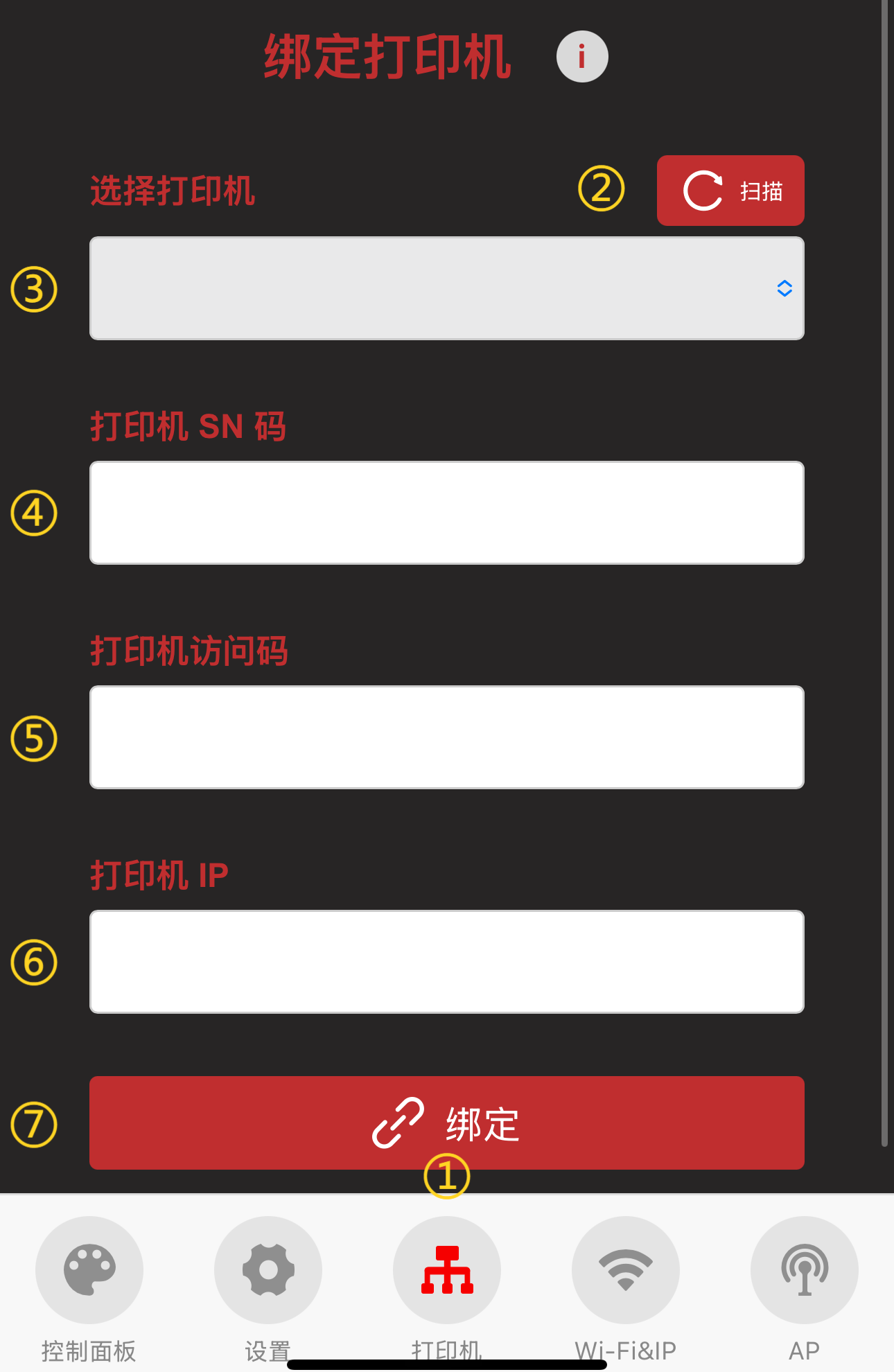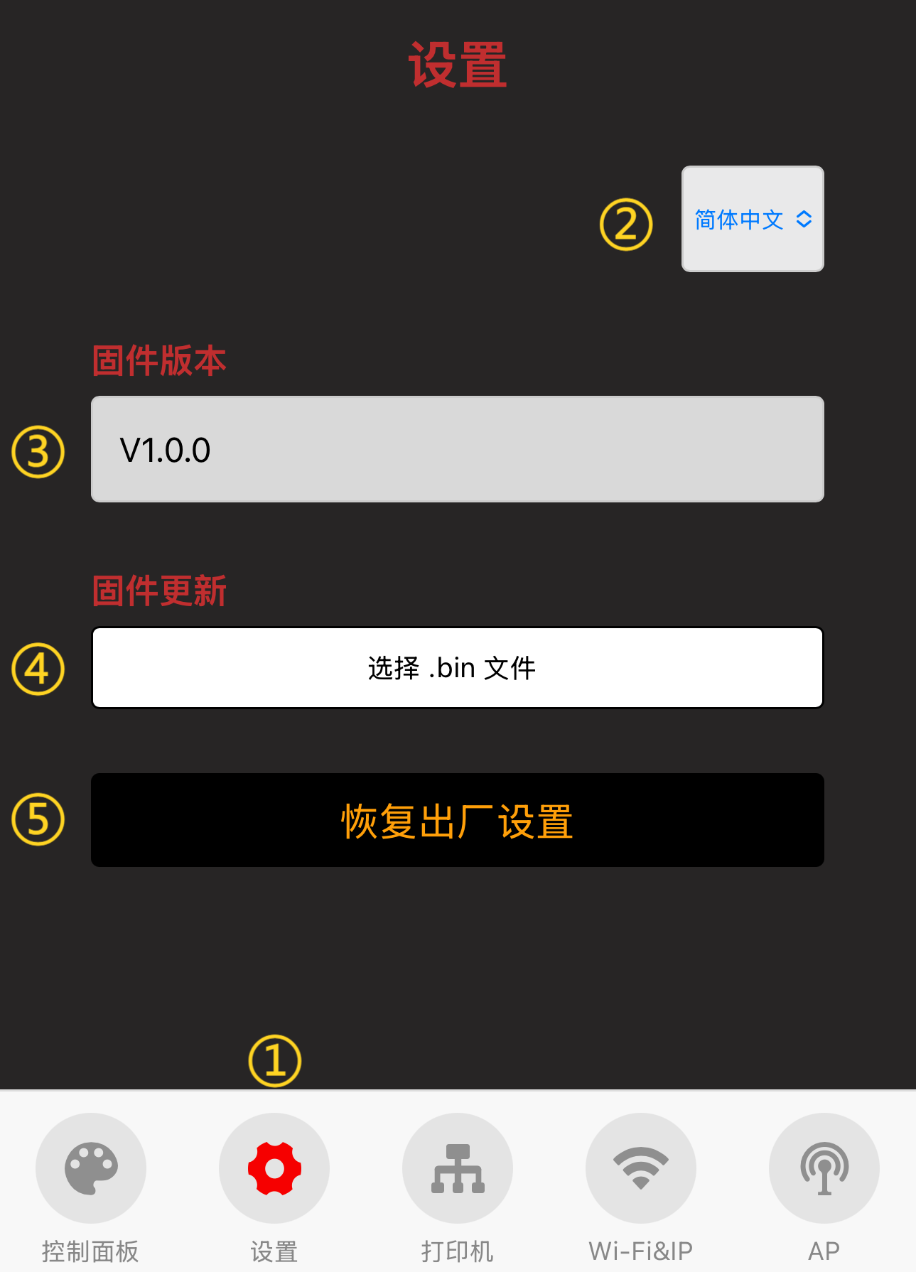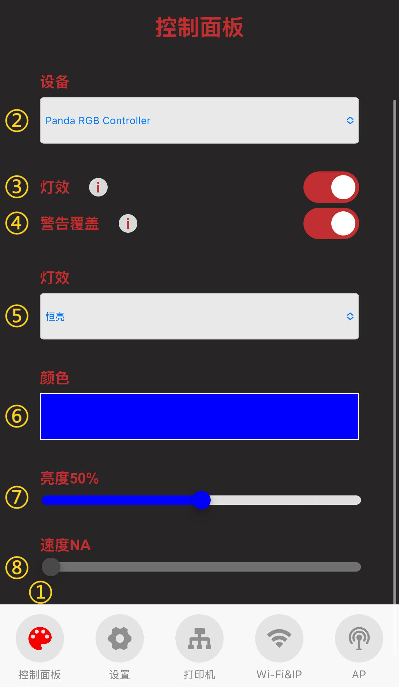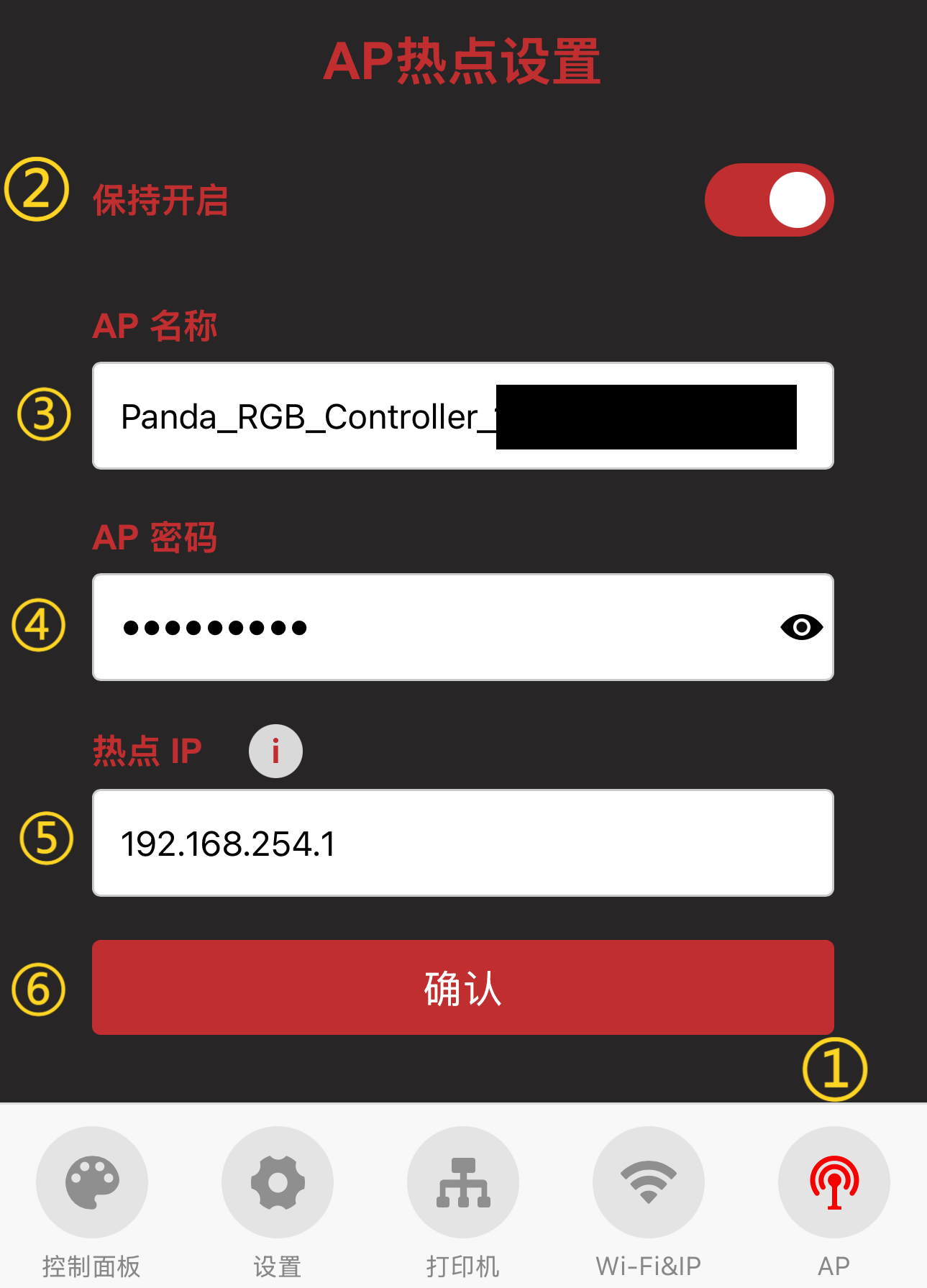 ⑤ 热点IP(默认的热点 IP 为: 192.168.254.1, 如果您自己路由器的 IP 号段也为 192.168.254.xxx, Panda RGB Controller 与路由器的 IP 号段相同就会产生冲突, 并且导致 Panda RGB Controller 无法正常绑定到打印机, 请手动修改 Panda RGB Controller 的热点 IP 使其与路由器使用不同的 IP 号段)