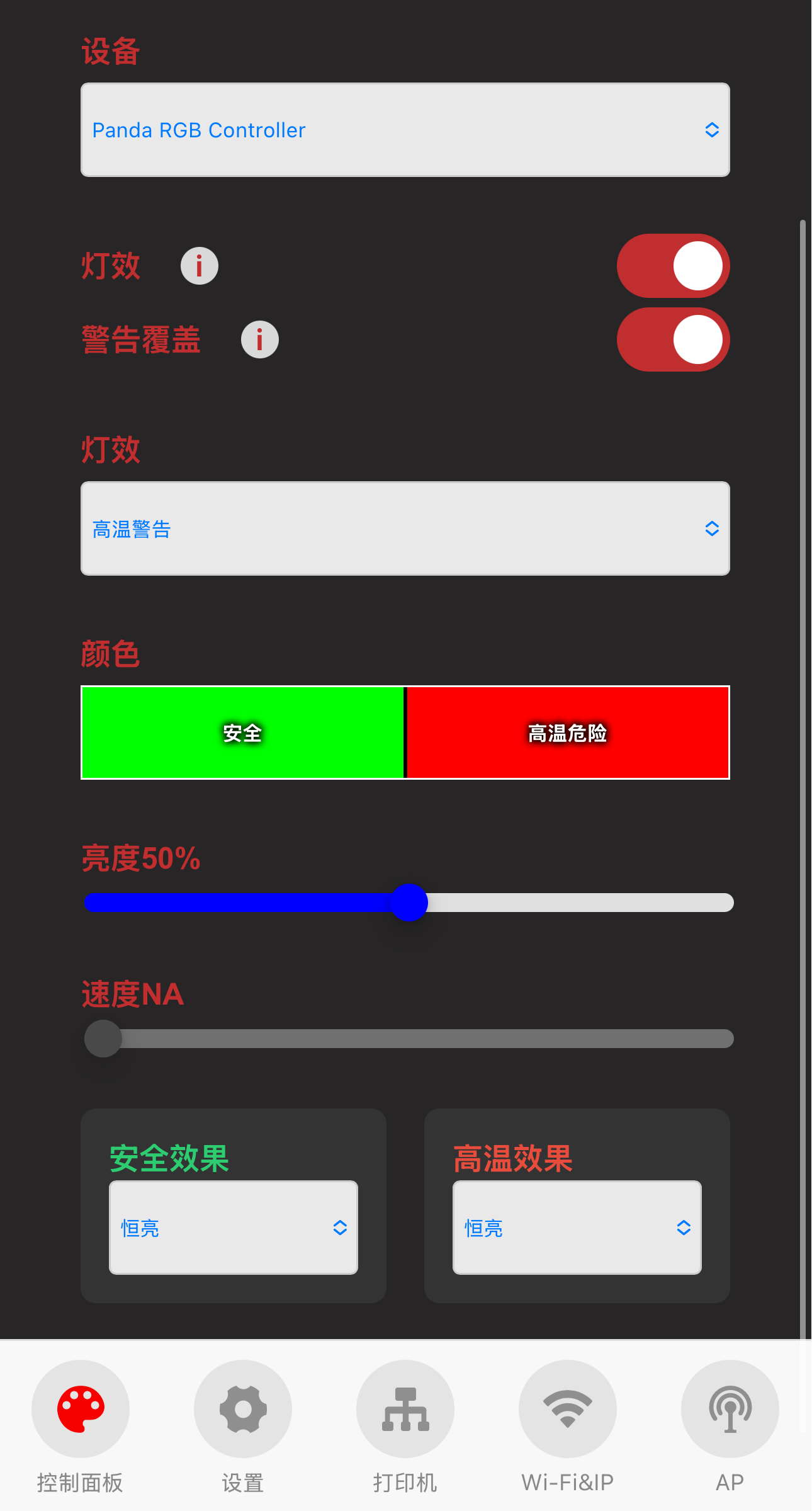 ⑤ 光线的颜色可以根据打印机的温度进行调整。您可以在“安全效果”和“危险效果”下选择两种照明效果,静态或闪光。