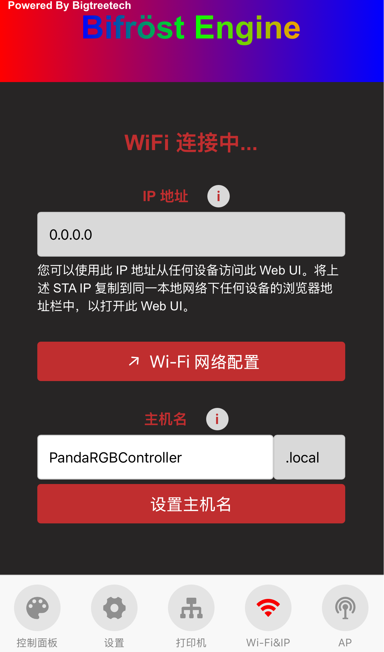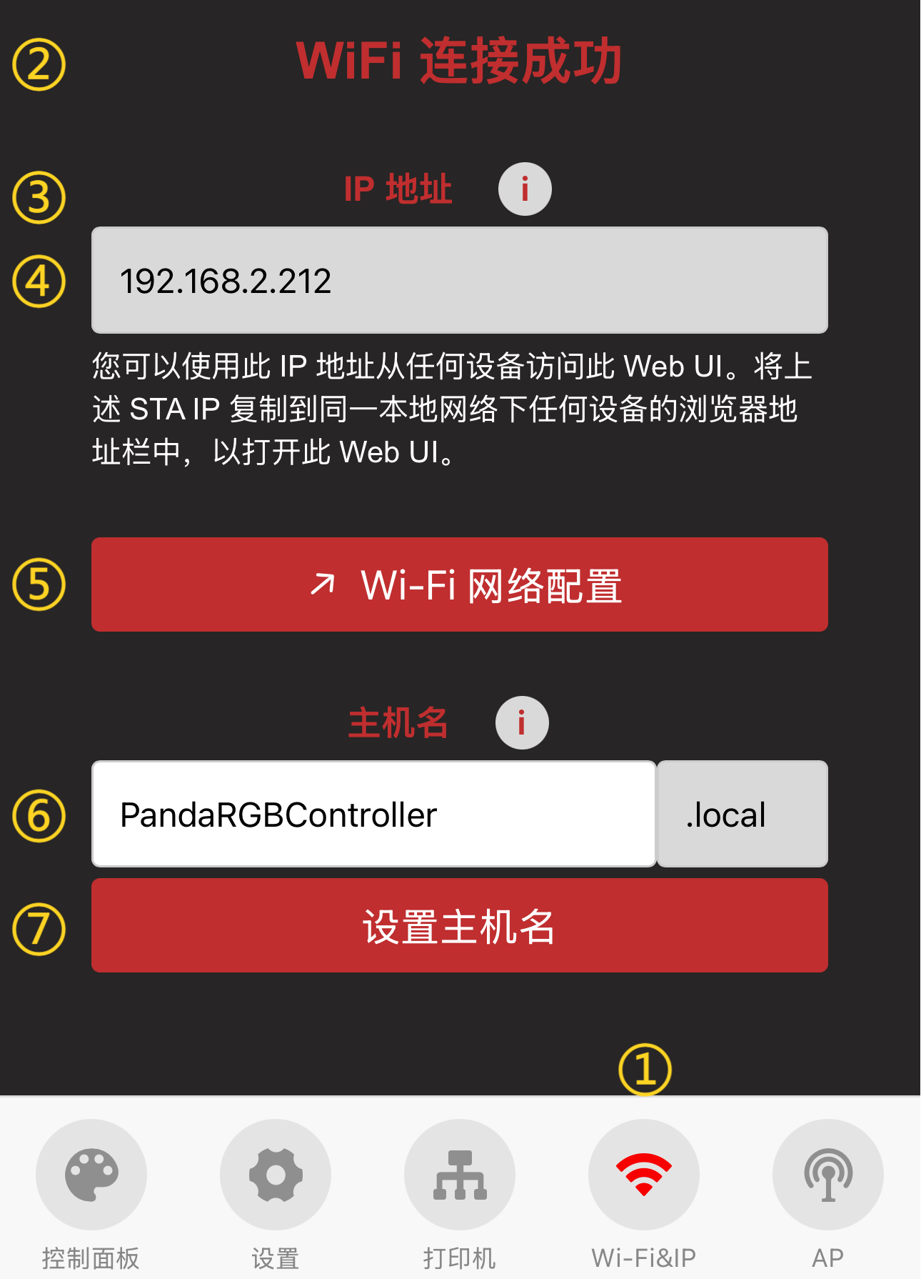 ⑥ 主机名显示,您可以使用主机名访问 Web UI。默认主机名为: PandaRGBController。如果您不记得 IP 地址,可以在浏览器地址栏中输入主机名加上 .local 访问 Web UI (例如: http://PandaRGBController.local)。点击文本框可以编辑主机名, 点击 设置主机名 按钮确认修改